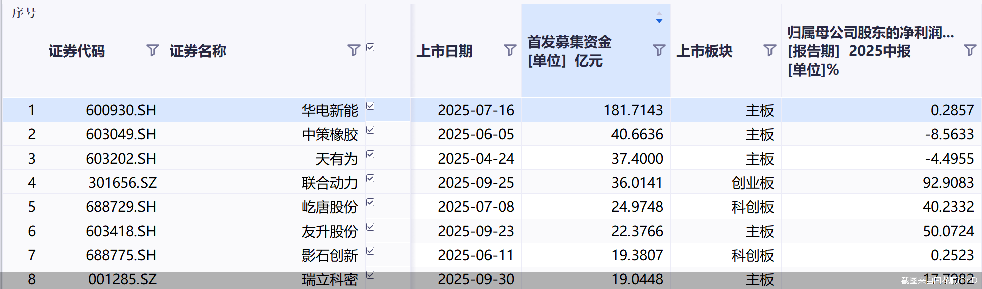 经同花顺iFinD统计,前三季度首发募资额位列第三、第四、第五位的新股分别系天有为(603202)、联合动力、屹唐股份,对应首发募集资金分别约为37.4亿元、36.01亿元、24.97亿元。