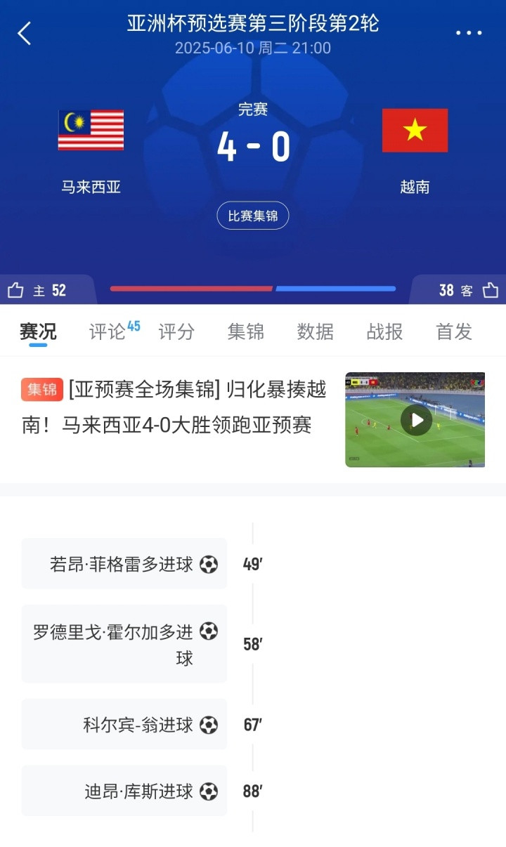 直播吧10月07日讯昨日,FIFA官方发布了马来西亚足协以及七名归化球员伪造篡改文件的具体裁决,其中透露在马来西亚4-0大胜越南的第二天,国际足联便收到了正式投诉。
