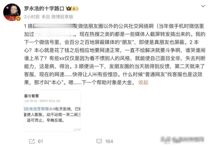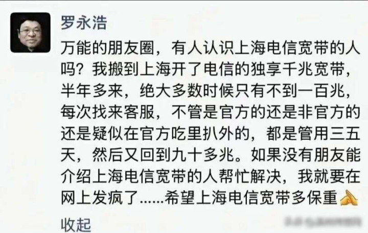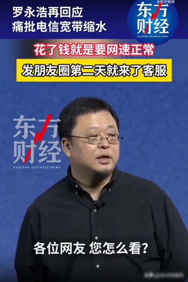 事情得从去年夏天说起,罗永浩搬去上海,花了钱办了千兆宽带,可网速一直卡在百兆以下,找客服,问题刚修好没几天又回来,来回几次他实在忍不了,在朋友圈说再不解决就要在网上发疯了,没想到这话一发,热搜就上了,好多人都说,自己也遇到过这事儿。